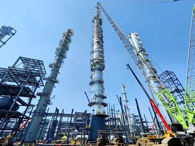 乙醇塔是本項(xiàng)目核心設(shè)備,直徑4.8米,高度116米,總重380噸,分4段進(jìn)場(chǎng)組對(duì)。尤其最后吊裝的上段設(shè)備長(zhǎng)達(dá)25米、重達(dá)126噸,吊裝難度大,精度要求高。面對(duì)場(chǎng)地條件受限、惡劣天氣等不利因素,項(xiàng)目組與各參建方精心策劃、周密部署,通過(guò)科學(xué)管理,在38天窗口期內(nèi)高效完成包括超高、超重塔器及反應(yīng)器的安裝,為項(xiàng)目的全面推進(jìn)創(chuàng)造了有利條件。