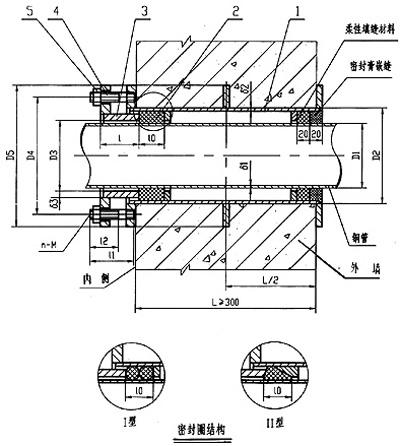 穿線密閉套管說明:1、當(dāng)迎水面為腐蝕性介質(zhì)時(shí),可采用封堵材料將縫隙封堵;2.套管穿墻處如遇非混凝土墻壁時(shí),應(yīng)局部改用混凝土墻壁,其澆注范圍應(yīng)比翼環(huán)直徑(DS)大200,并且必須將套管一次澆固…