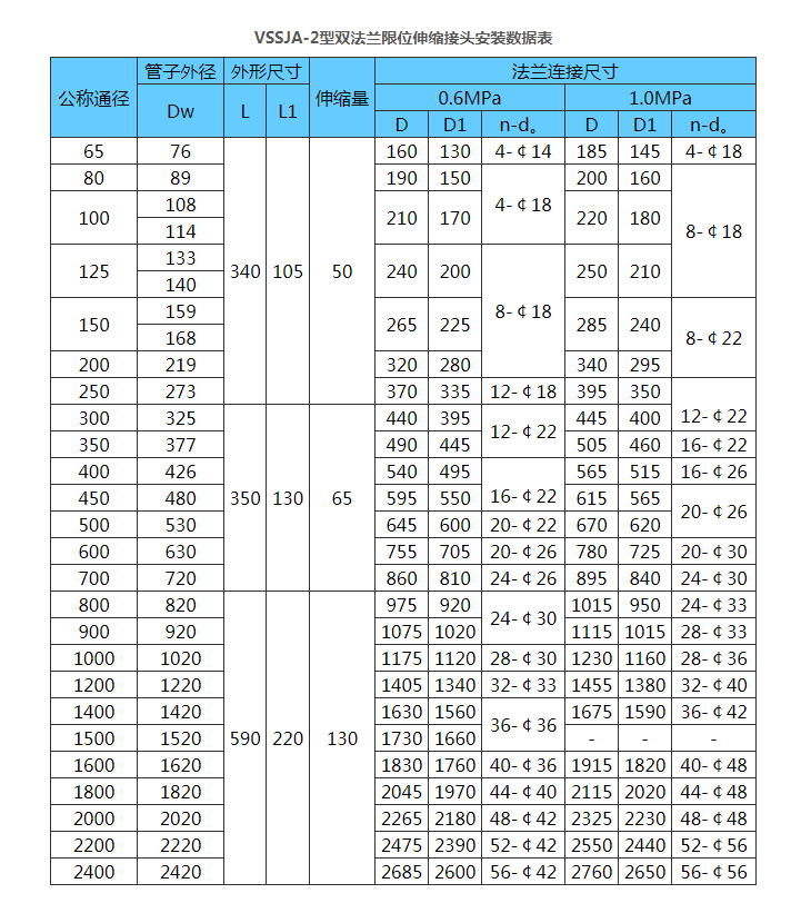 雙法蘭限位伸縮接頭應(yīng)用范圍VSSJA-2型雙法蘭限位伸縮接頭適用于輸送海水、淡水、冷熱水、飲用水、生活污水、原油、燃油、潤(rùn)滑油、成品油、空氣、煤氣、溫度不高于250度的蒸汽和顆粒粉狀等介質(zhì)。雙法蘭限位伸縮接頭功…